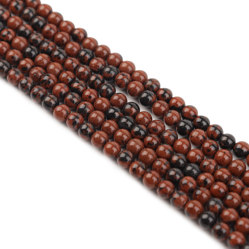 Obsidian is a naturally occurring amorphous volcanic glass composed primarily of silicon dioxide (SiO2) with significant iron and magnesium content. Mahogany Obsidian's characteristic patterning results from iron oxide inclusions — primarily magnetite and hematite — distributed through the base glass, producing the red-brown to mahogany streaks and swirls. Because it is amorphous, obsidian has no true crystal structure and does not cleave — it fractures conchoidally, producing extremely sharp edges.